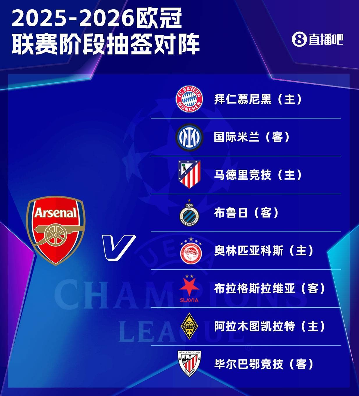 直播吧08月30日讯 欧足联官方公布欧冠联赛阶段赛程,阿森纳赛程如下。